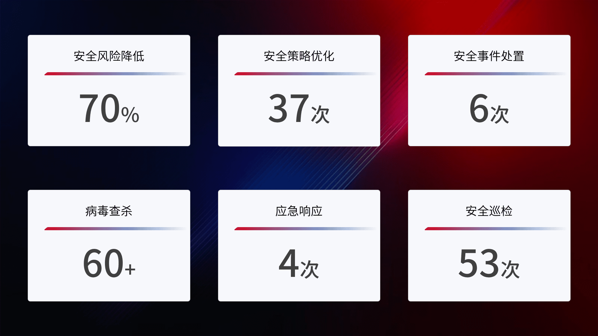 提供全面的安全事件报告体系,,,包括处置报告、、、、周报、、、季度和年度总结,,,结合持续监控,,帮助客户深入了解网络安全状况。。。。